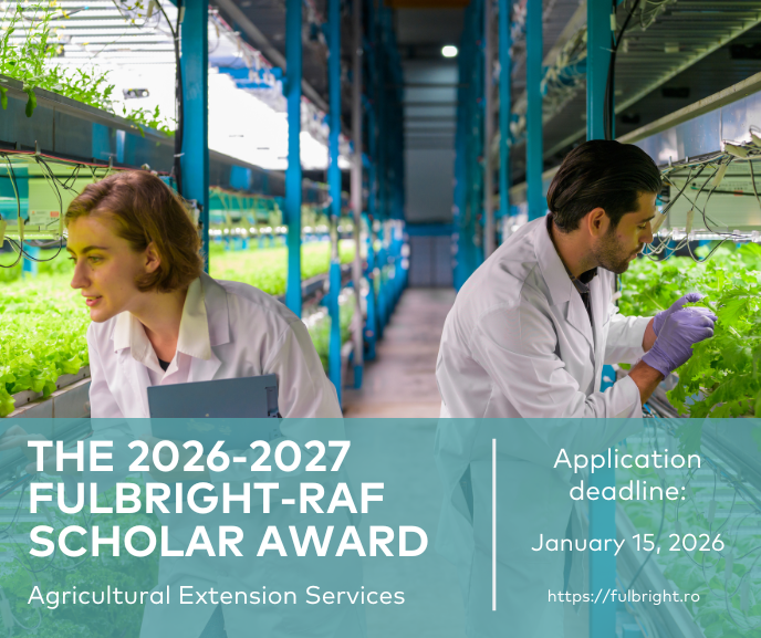 The Romanian-U.S. Fulbright Commission announces the Fulbright-RAF (Romanian-American Foundation) Scholar Award in the field of Agricultural Extension Services, designed for Romanian academics who wish to carry out a semester-long fellowship in residence, at a designated U.S. university, for study and research, individual mentorship, professional training, classroom observation and participation in community-based extension activities.