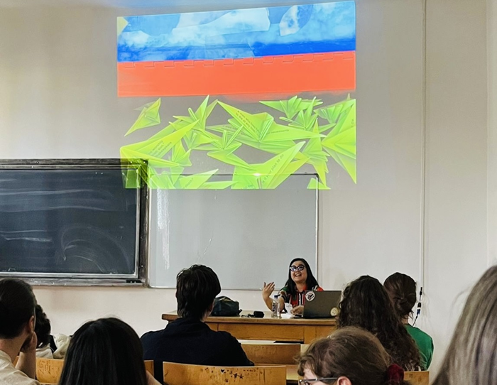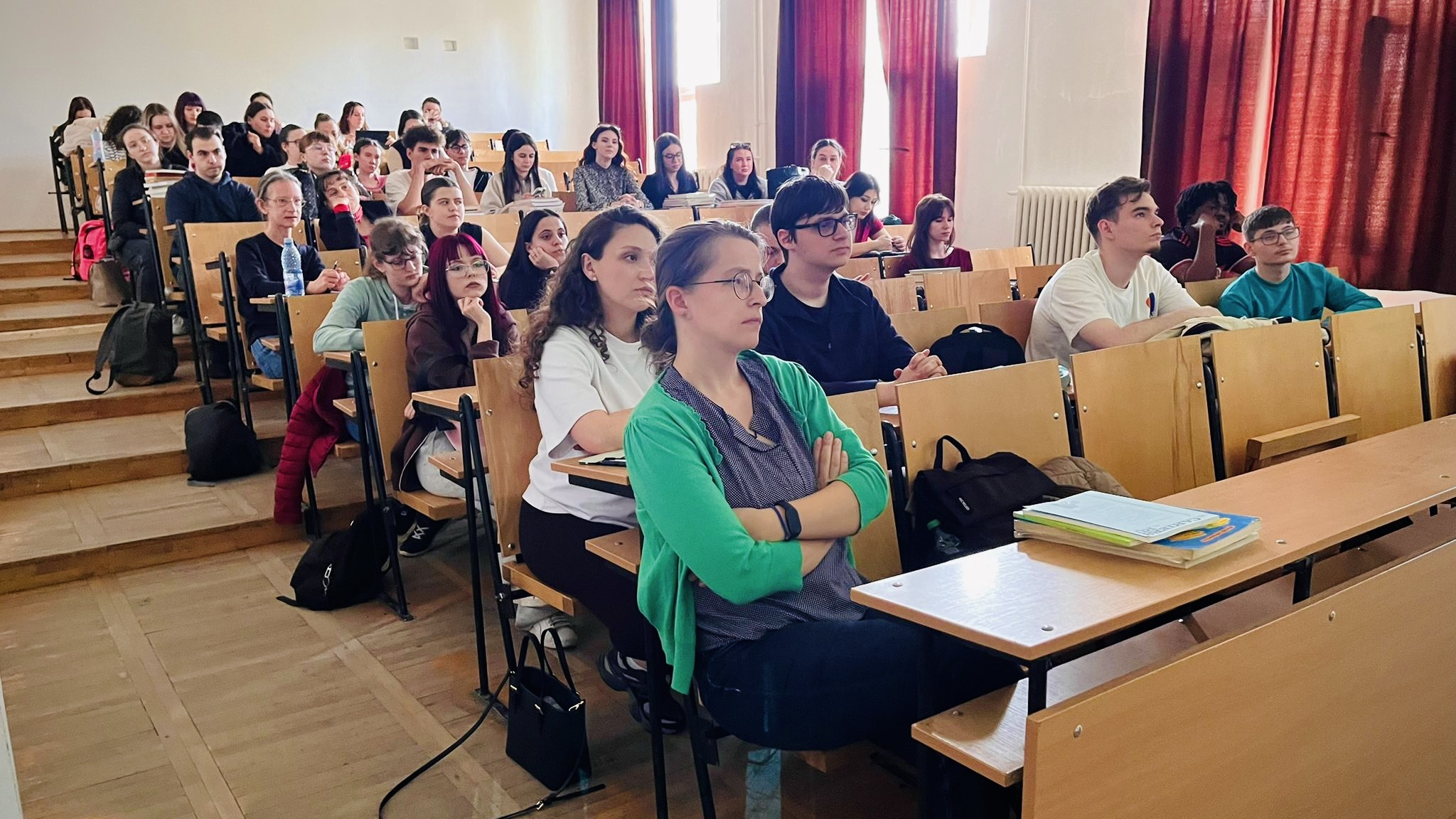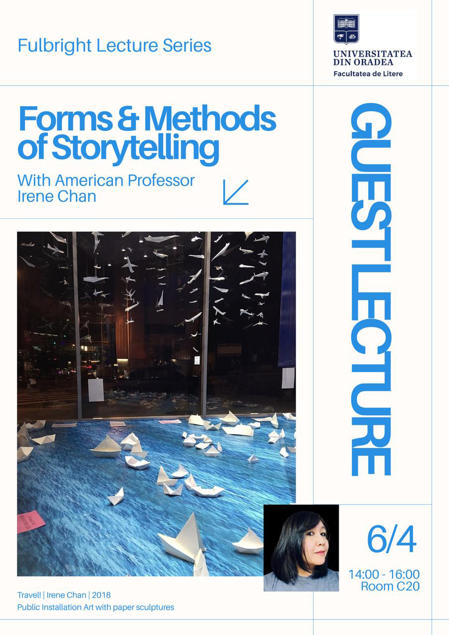 Professor Irene Chan, U.S. Fulbright Scholar at the University of Arts and Design in Cluj-Napoca, delivered a lecture titled “Forms & Methods of Storytelling” at the University of Oradea, organized by Fulbright ETA Elyse Reed and the Head of the Department, Dr. Giulia Siciu. Students from the English Language and Literature Department, Faculty of Letters had the chance to observe and listen to Irene as she shared different storytelling techniques about Taoism, historical figures, personal memoirs, and folklore. The emphasis was on the diverse range of mediums employed, showcasing a harmonious mix of visual and textural components. With a lecture length of two hours, there was ample time to share complete stories.