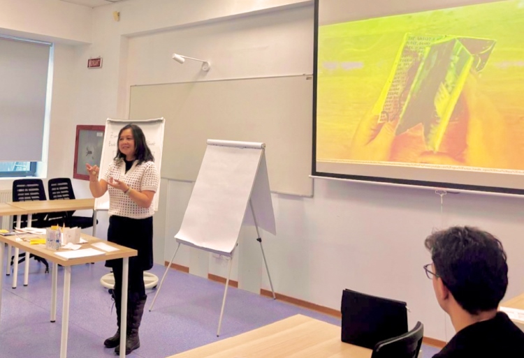 Professor Irene Chan, currently a Fulbright Scholar at the University of Arts and Design in Cluj-Napoca, was a guest lecturer during Fulbright Researcher Raluca Alexandrescu’s three-day workshop series titled “Innovation Through an Interdisciplinary Lens” at the Romanian-American University in Bucharest. On the initial day, Irene demonstrated to the students three different book structures, each crafted from a single sheet of paper. Raluca addressed the class, discussing how imagination and entrepreneurship can emerge from simple beginnings. On the second day, the students reconvened and presented their innovative structures, which were developed from the foundational designs along with their personal concepts for filling the books. Subsequently, Irene delivered a lecture on her approach to utilizing innovation in storytelling within her visual arts practice. On the third day, Raluca taught the students ideation strategies for entrepreneurship.