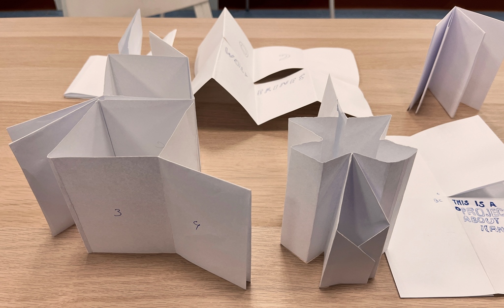 Professor Irene Chan, currently a Fulbright Scholar at the University of Arts and Design in Cluj-Napoca, was a guest lecturer during Fulbright Researcher Raluca Alexandrescu’s three-day workshop series titled “Innovation Through an Interdisciplinary Lens” at the Romanian-American University in Bucharest. On the initial day, Irene demonstrated to the students three different book structures, each crafted from a single sheet of paper. Raluca addressed the class, discussing how imagination and entrepreneurship can emerge from simple beginnings. On the second day, the students reconvened and presented their innovative structures, which were developed from the foundational designs along with their personal concepts for filling the books. Subsequently, Irene delivered a lecture on her approach to utilizing innovation in storytelling within her visual arts practice. On the third day, Raluca taught the students ideation strategies for entrepreneurship.
